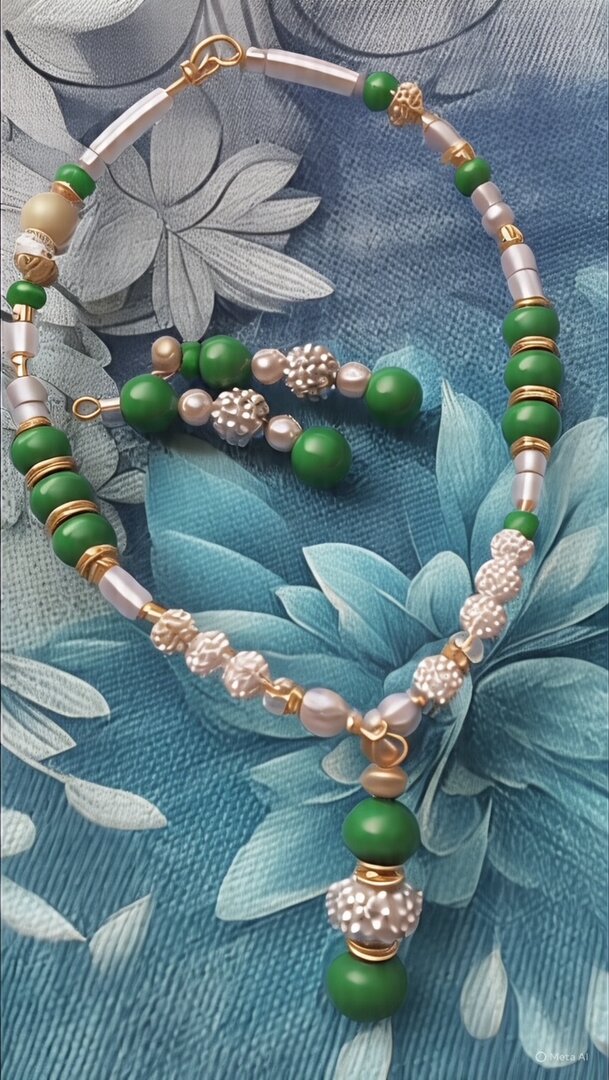 The Green & Silver Necklace and Earring Set features a stylish combination of vibrant green and elegant silver accents perfect for adding a touch of sophistication to any occasion.